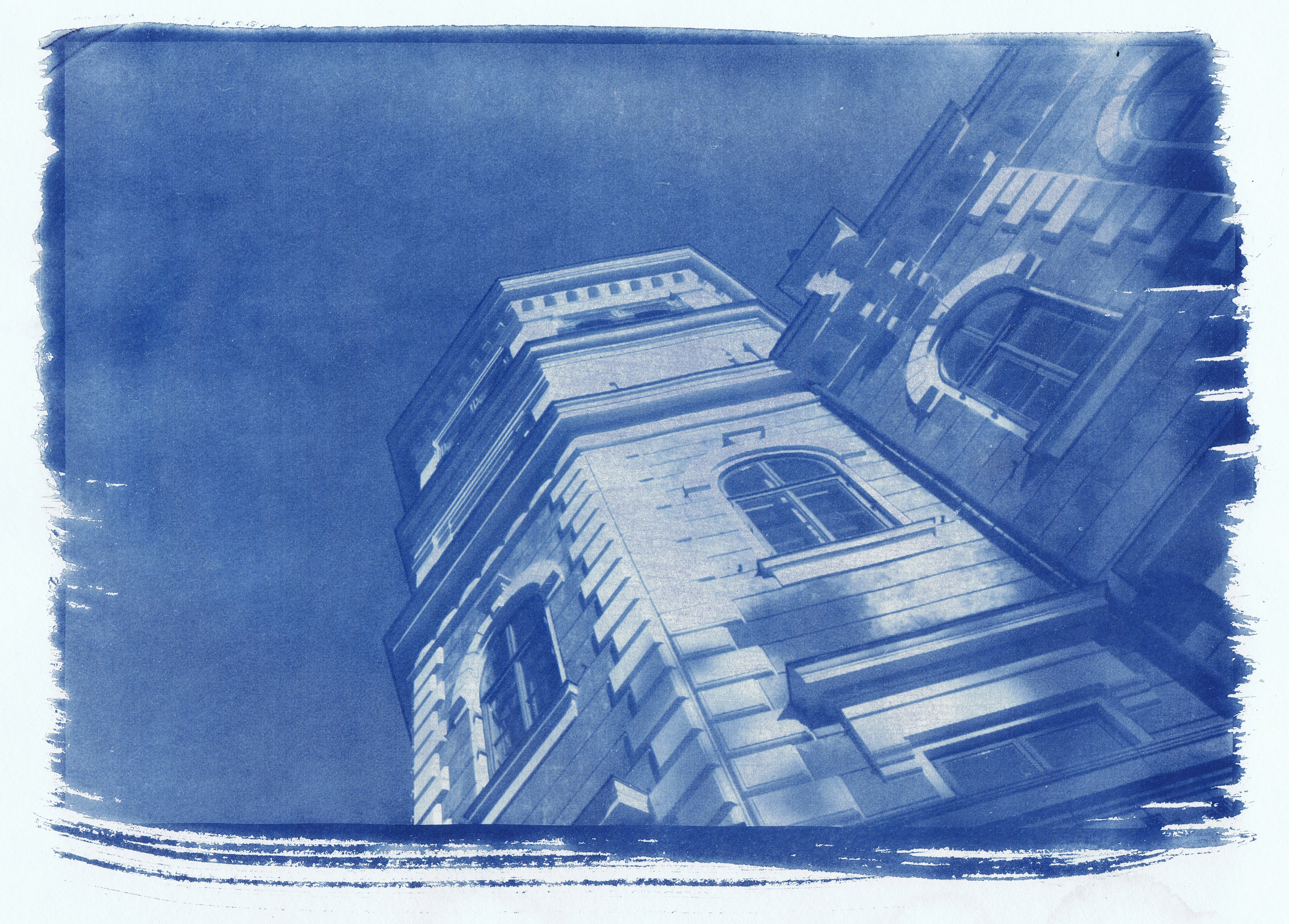 Die Cyanotypie ist eine mehr als 170 Jahre alte Methode, lichtstabile Bilder herzustellen. Sie wurde im Jahr 1839-42 von dem englischen Naturwissenschaftler und Astronom Sir John Herschel entwickelt. Die Cyanotypie war das dritte Verfahren nach der Daguerrotypie und Talbotypie/Kalotypie zur Herstellung von stabilen fotografischen Bildern, welche ohne Silber auskommt. Es beruht auf der Tatsache, dass eine Eisenverbindung = Ammoniumeisen(III)-Citrat nach der Belichtung in Wasser einen dunkelblauen bzw. cyanofarbenen Niederschlag erzeugt. Belichtet wird allerdings nicht in der Dunkelkammer, sondern ganz einfach unter Sonnenlicht oder mit Hilfe eines Gesichtbräuners.